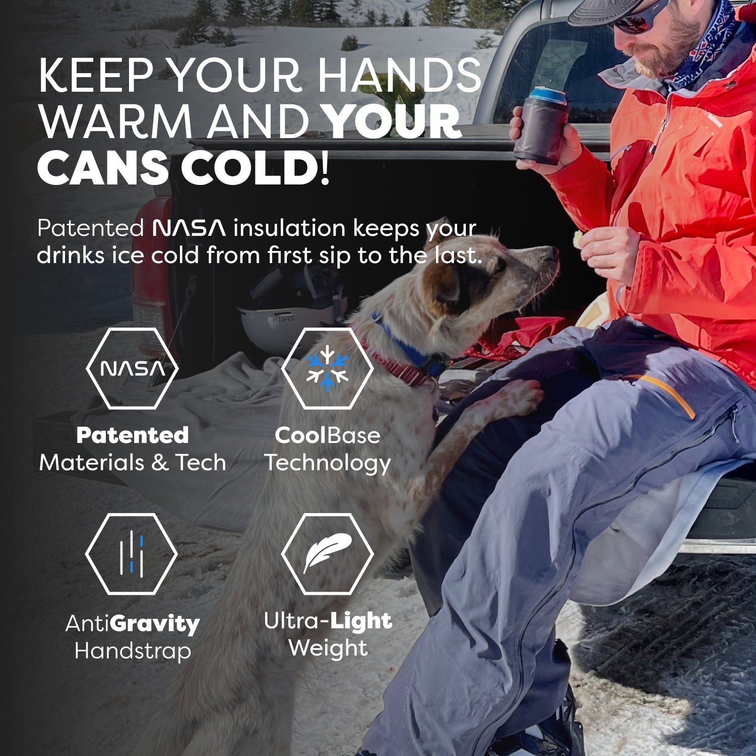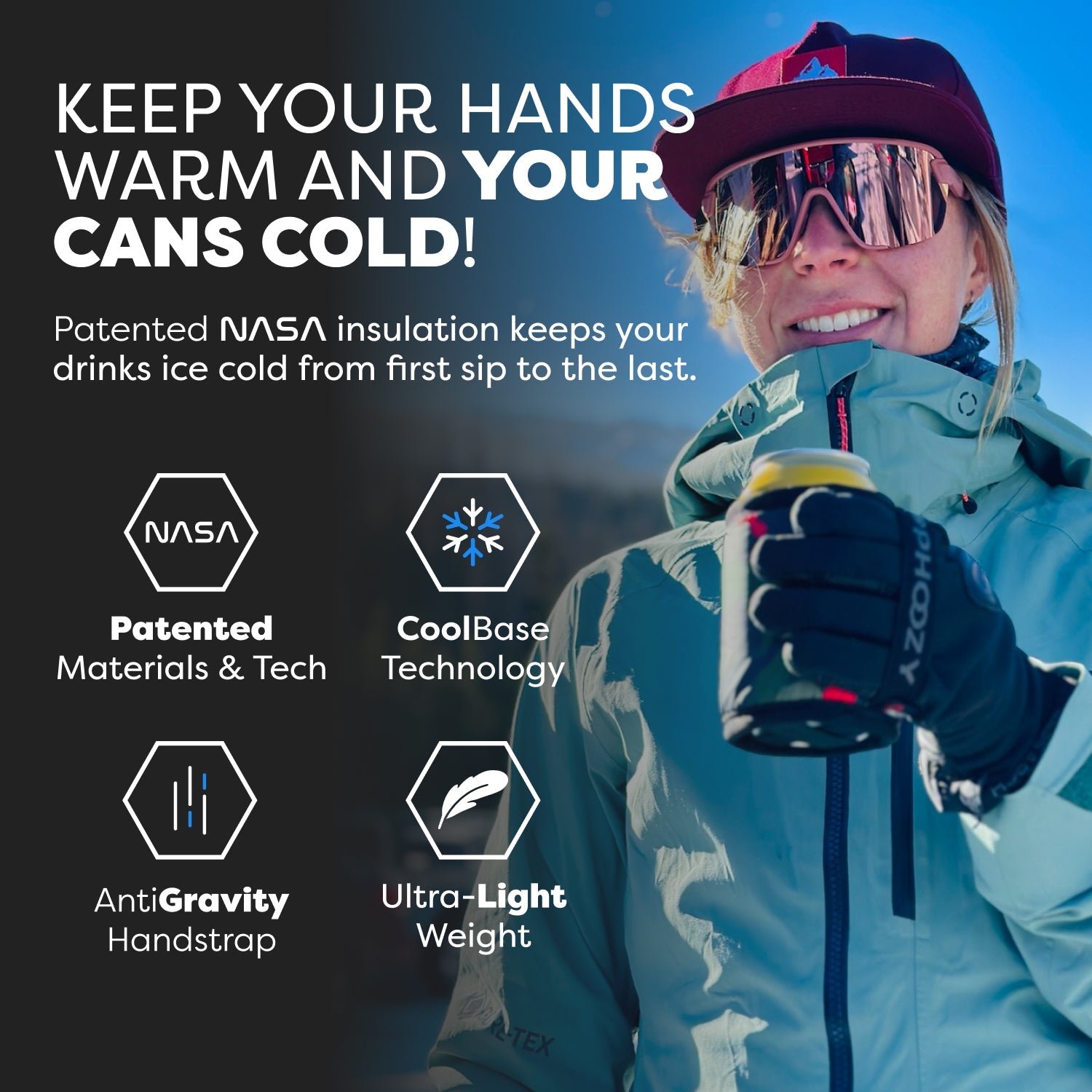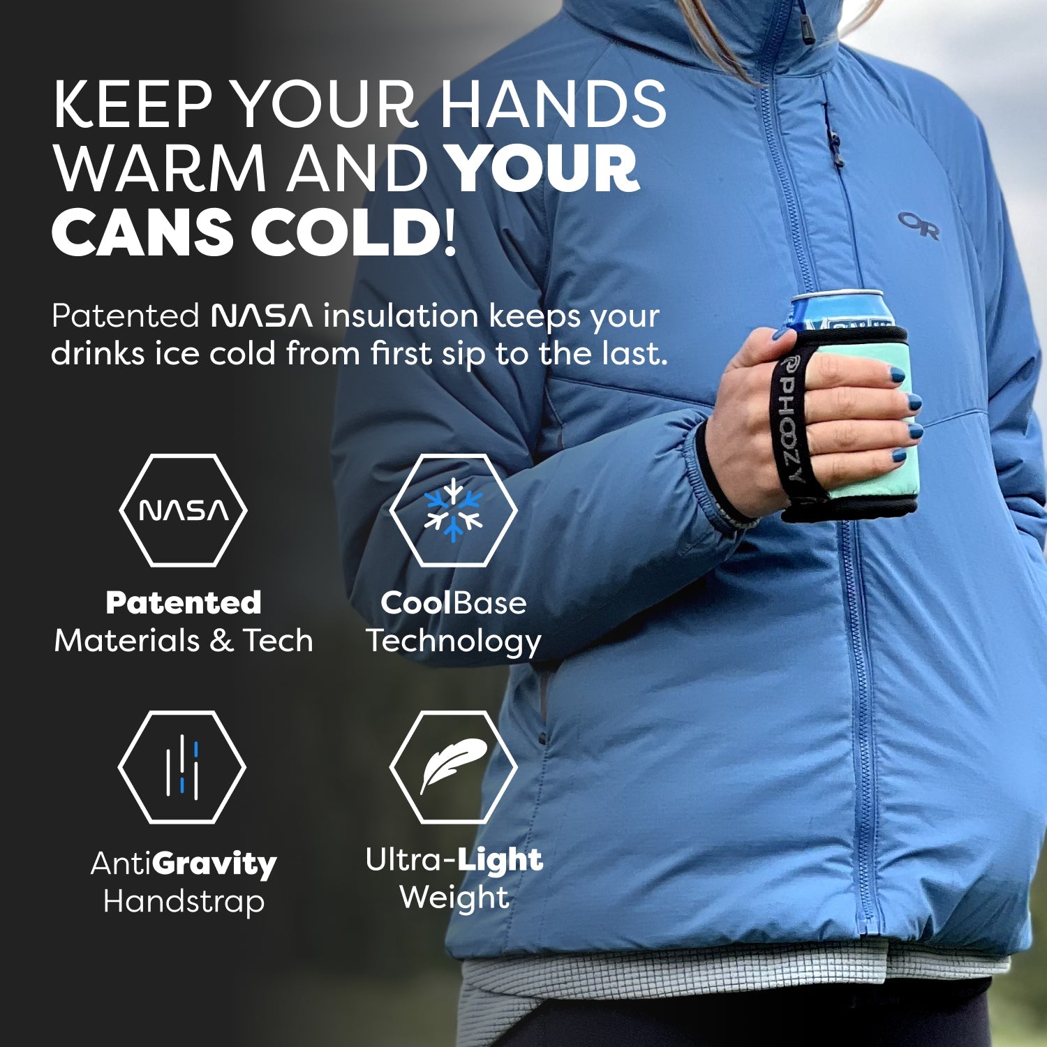 The ultimate insulated can cooler. Made from patented spacesuit technology to keep your drinks colder longer. Ultra-lightweight, packable design doesn't weigh you down and the Anti-Gravity hand strap keeps your drinks comfortably in your hand - just wait until you try it! You will never use any other Can Cooler again!
