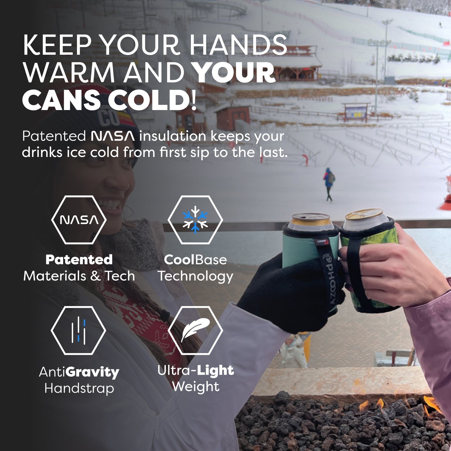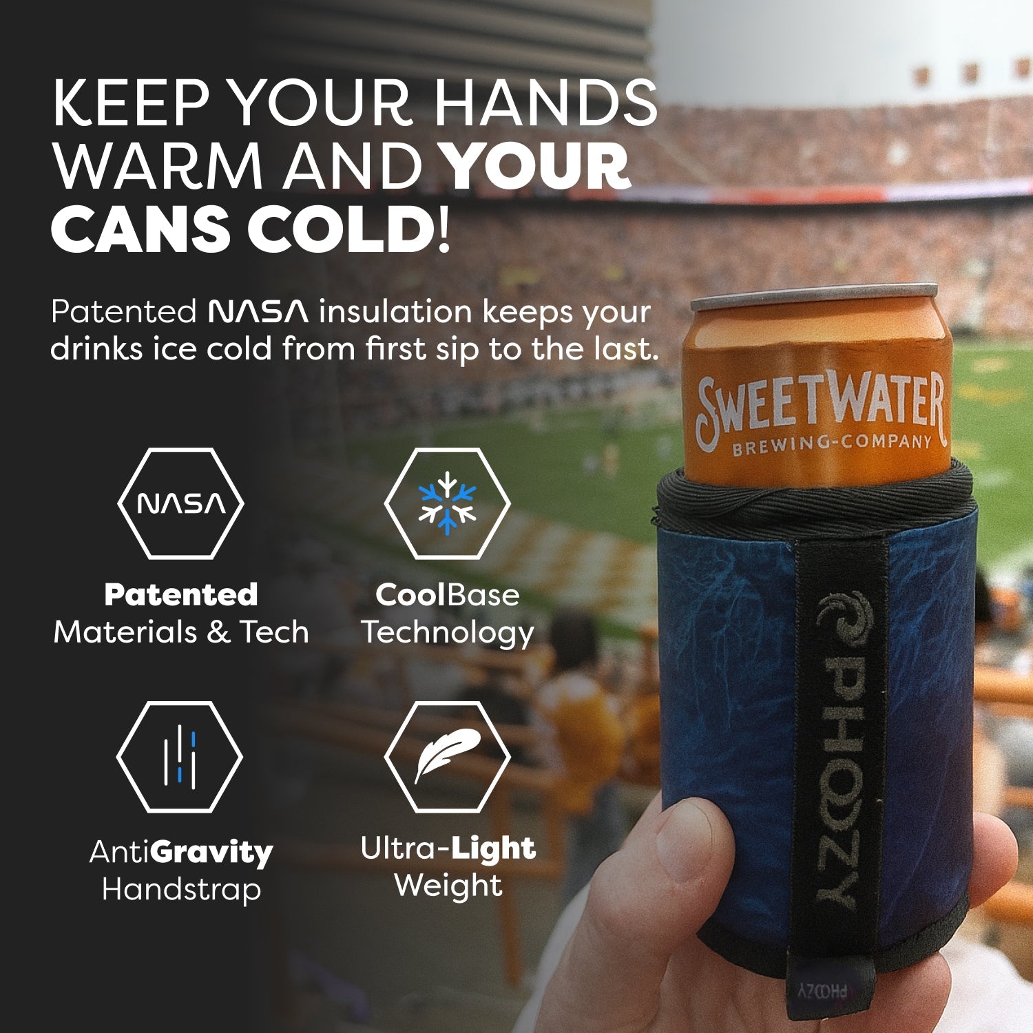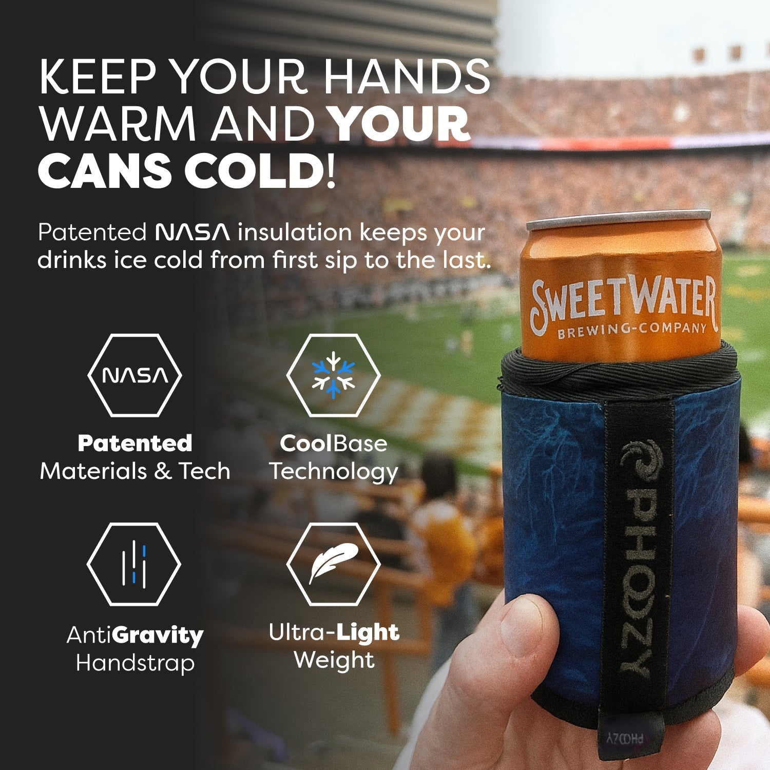 The ultimate insulated can cooler. Made from patented spacesuit technology to keep your drinks colder longer. Ultra-lightweight, packable design doesn't weigh you down and the Anti-Gravity hand strap keeps your drinks comfortably in your hand - just wait until you try it! You will never use any other Can Cooler again!
